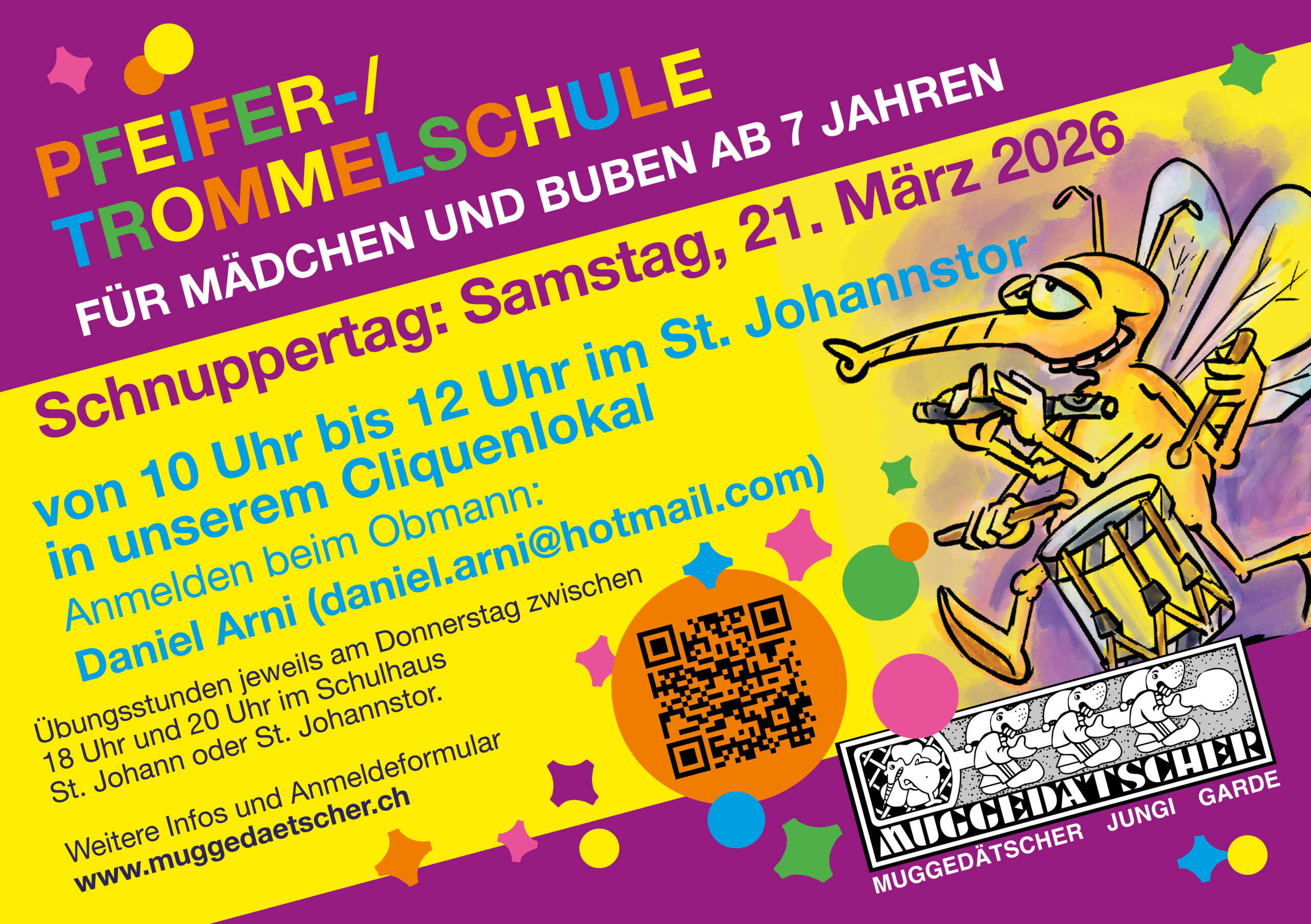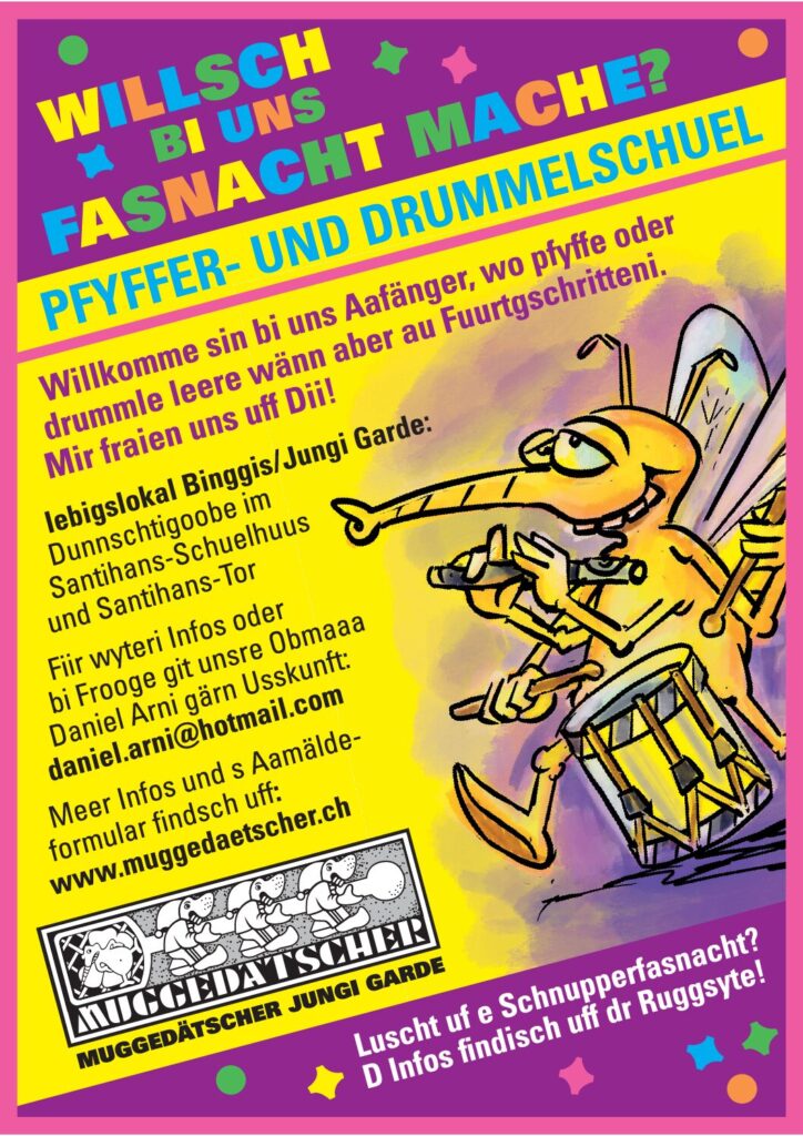 Die Fasnachtsgesellschaft Muggedaetscher ist ein politisch und konfessionell neutraler Verein, der die Tradition der Basler Fasnacht pflegt, und Männern sowie Frauen offen steht. Grossen Wert legen wir auf das Trommeln und Pfeifen. Der Spass kommt dabei jedoch nicht zu kurz. Ebenso wichtig ist uns die Geselligkeit. Neuerungen, die der Lauf der Zeit mit sich bringt, begegnen wir aufgeschlossen, ohne dabei die traditionellen Elemente der Basler Fasnacht über Bord zu werfen. Beispielsweise treten wir am Monster-Trommelkonzert (“Drummeli”) entweder mit einem speziell fuer diese Vorfasnachtsveranstaltung arrangierten Vortrag auf oder tragen einen traditionellen Fasnachtsmarsch vor. Als sogenannter Stammverein verpflichten wir uns zusätzlich zum alle drei Jahre wiederkehrenden Auftritt am Drummeli zur Fasnachtsteilnahme mit mindestens je 9 Vorträblern, Pfeifern und Tambouren sowie zur Führung einer Jungen Garde samt “Binggisziigli”, in welcher Kinder nebst dem Spielen des Instruments von Grund auf lernen, was den besonderen Reiz der Basler Fasnacht ausmacht und wie man sich darauf vorbereitet. Mitglieder, die alles etwas ruhiger angehen, aber vielleicht trotzdem am Drummeli als Statisten zusammen mit dem Stamm auf der Buehne stehen wollen, sind in der Alten Garde richtig.